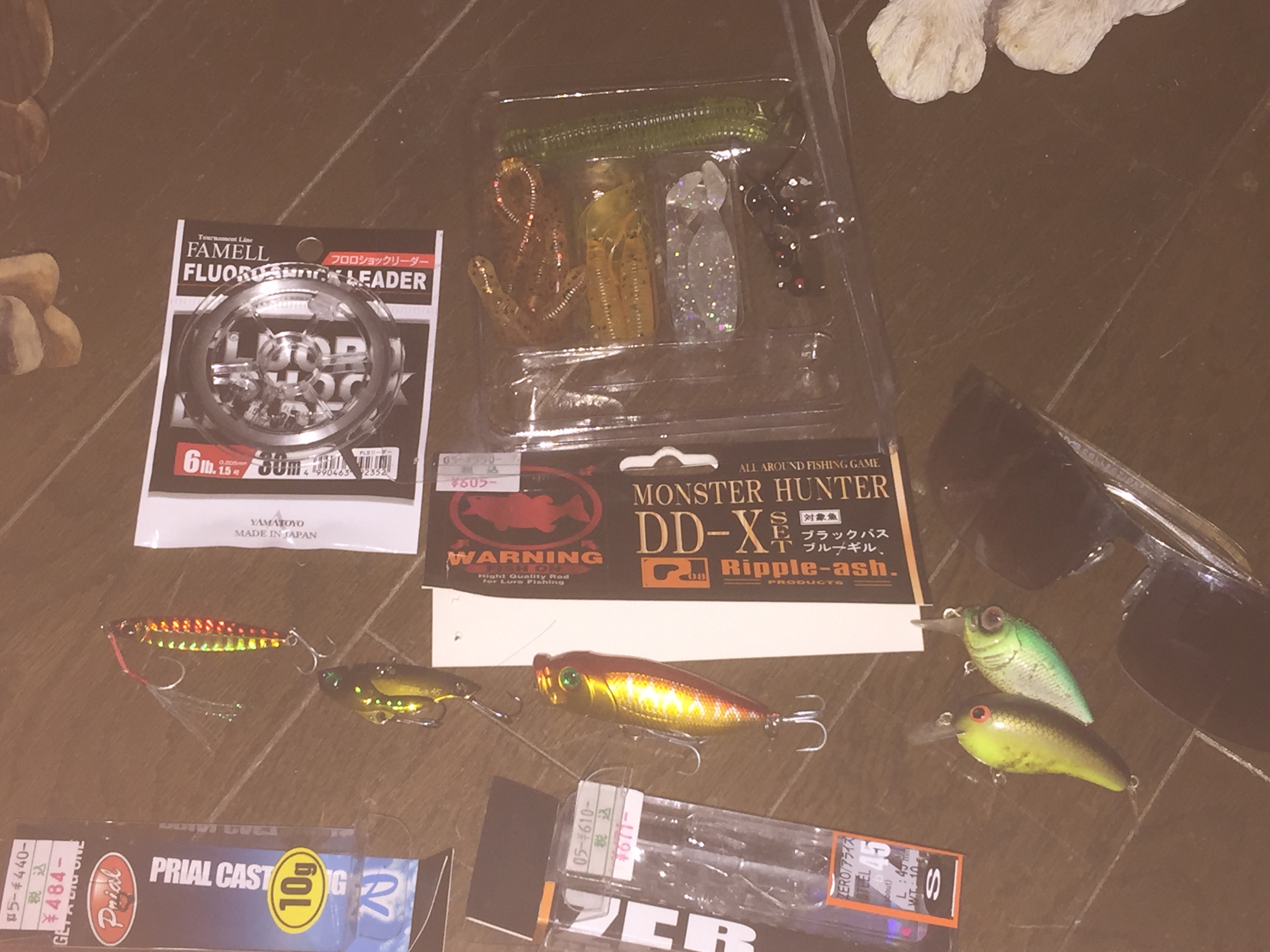 後日ダムサイトにて釣り予定のためあんま要らんもん含め散財。目当ての1つはナベ。スカートの無いDゾーン(1/4~1/2ozくらい)しか無かった。300円は高いわ。他の目当てはラバジ。およそ200円の4個にスモラバ4個。こいつらすぐ失くすからOK。